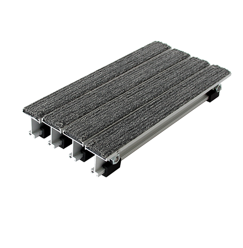嵌入式的铝合金地垫安装后,与地面齐平。方便推拉门以及推车的同行。正常情况下,铝合金地垫的称重在1500公斤每平米,不会变形。