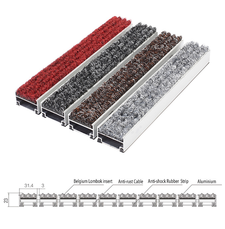 2.Insert: Beaulieu Lombok and Jave Gel from Belgium, Milliken from USA, Calypso and Centaur and Traffic GP from VEBE Netherland, Nouto and A.T. from German, Ribbed from Taiwan, and so on. Most of the insert has passed the fire proof certificates from our suppliers. The material is nylon 66 and polypropylene filament yarn with loop-pile instructure. Rubber and brush also can be used.