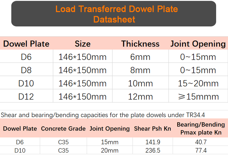 Load transfer plate dowel: 6mm, 8mm, 10mm, 12mm in Q355, also can be supplied in stainless steel for hot-dip galvanized as customized by different needs.