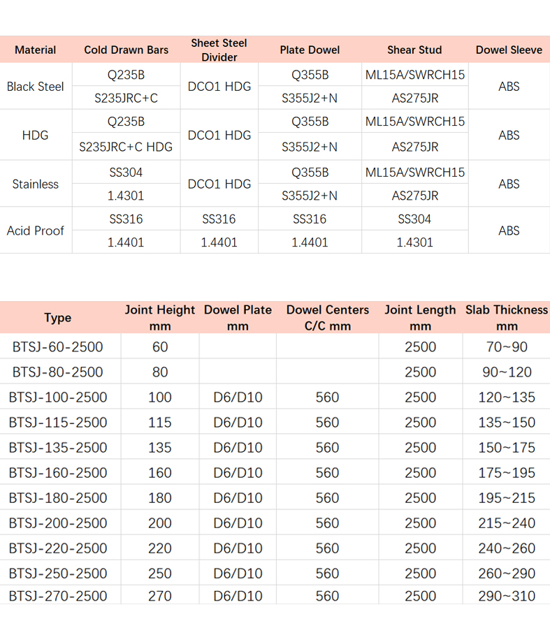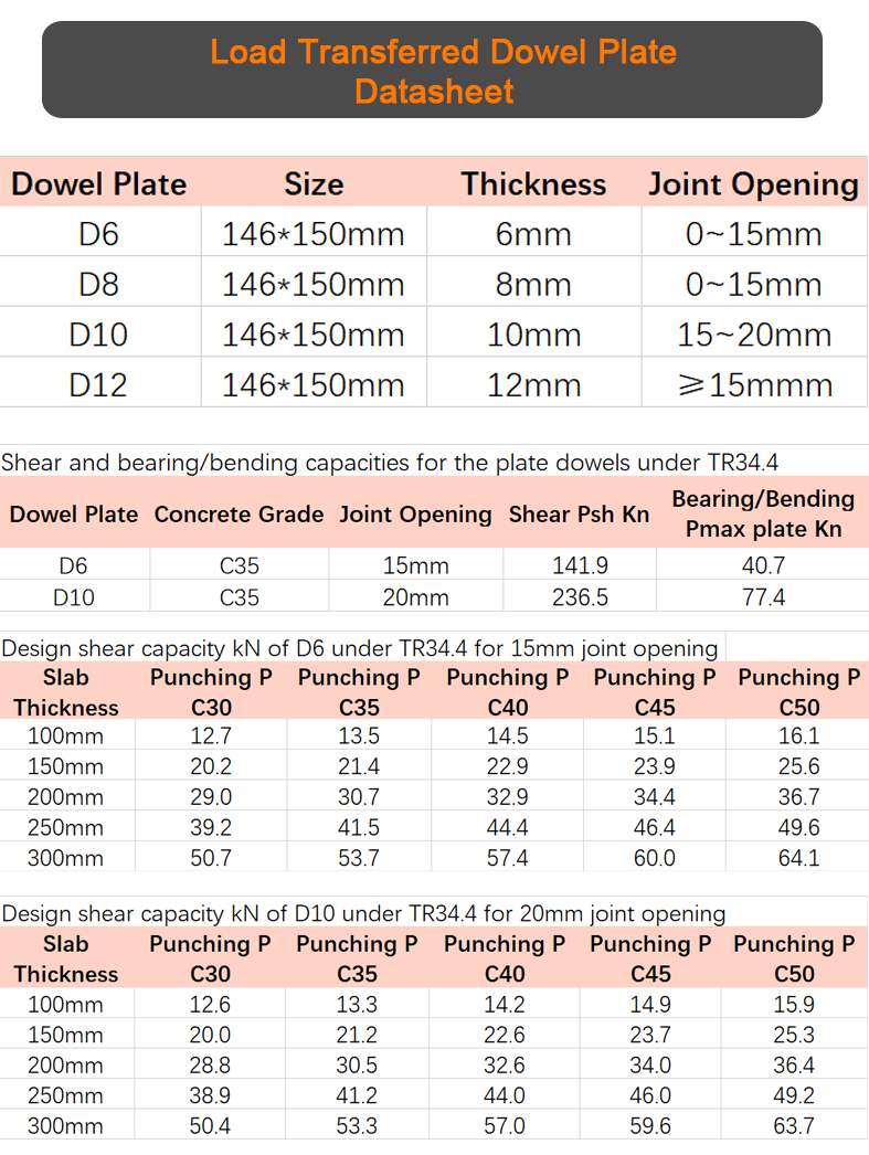 Load transfer plate dowel: 6mm, 8mm, 10mm, 12mm in Q355, also can be supplied in stainless steel for hot-dip galvanized as customized by different needs.