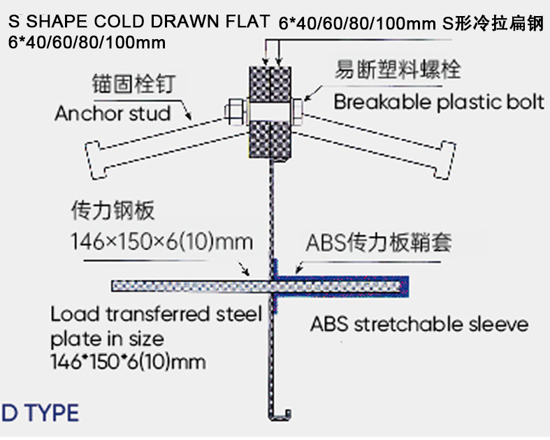 This joint system comprises two top sinusoidal profiled cold drawn flat bars, an divider plate, load transfer plate dowels and sleeves.